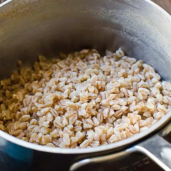 Fill a medium pot halfway with water and heat to boiling. Add Salt (1/2 tsp) and then stir in the Farro (3/4 cup). Reduce heat to a simmer and cook the farro until tender, about 20 to 25 minutes. Drain the farro and let cool to room temperature.