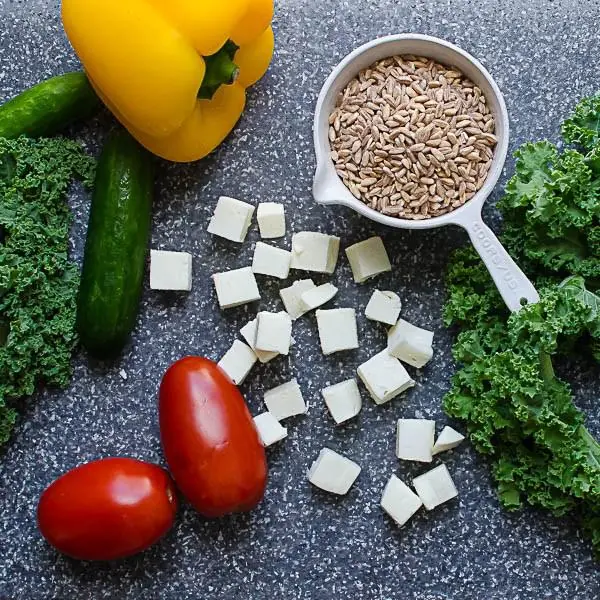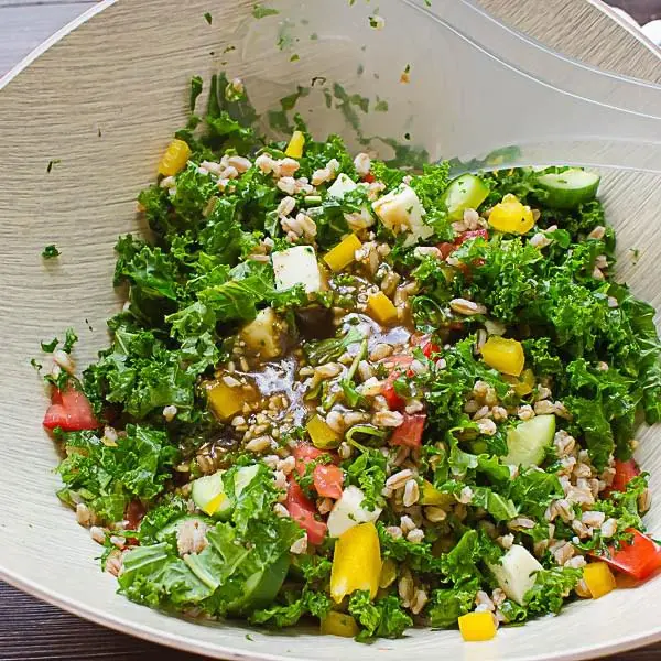 What makes this salad so inviting are the little treats you find along the way. A nugget of fresh mozzarella, a briny bite of kalamata olive and chewy hearty bits of farro. This Chicken Kale Farro Salad with Honey Balsamic Vinaigrette has a ton of flavor and it’s good for you too!