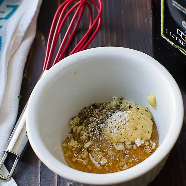 In a small bowl, combine the Dijon Mustard (1/2 tsp), Garlic (1 clove), Honey (1 tsp), Balsamic Vinegar (1 Tbsp), Olive Oil (3 Tbsp), Kosher Salt (1/2 tsp), and Freshly Ground Black Pepper (1/4 tsp). Whisk to emulsify.