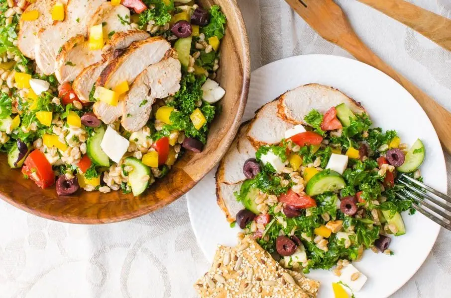 Add the cooled farro and the dressing to the salad and toss to combine completely. If you're serving the Chicken (2 cups) sliced, fan it out over the top of the salad and serve. Enjoy!