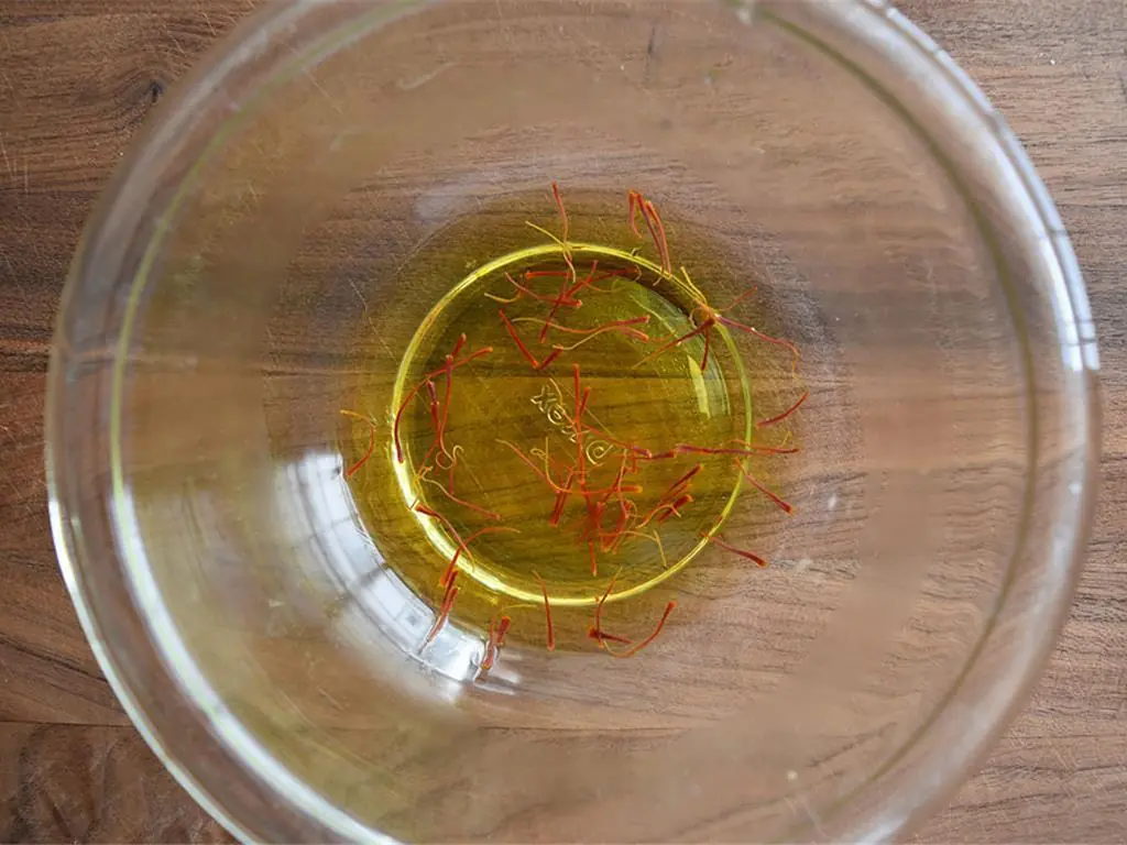Place Saffron Threads (20) in 1/2 cup of hot water in a small bowl and let steep for 15 minutes.