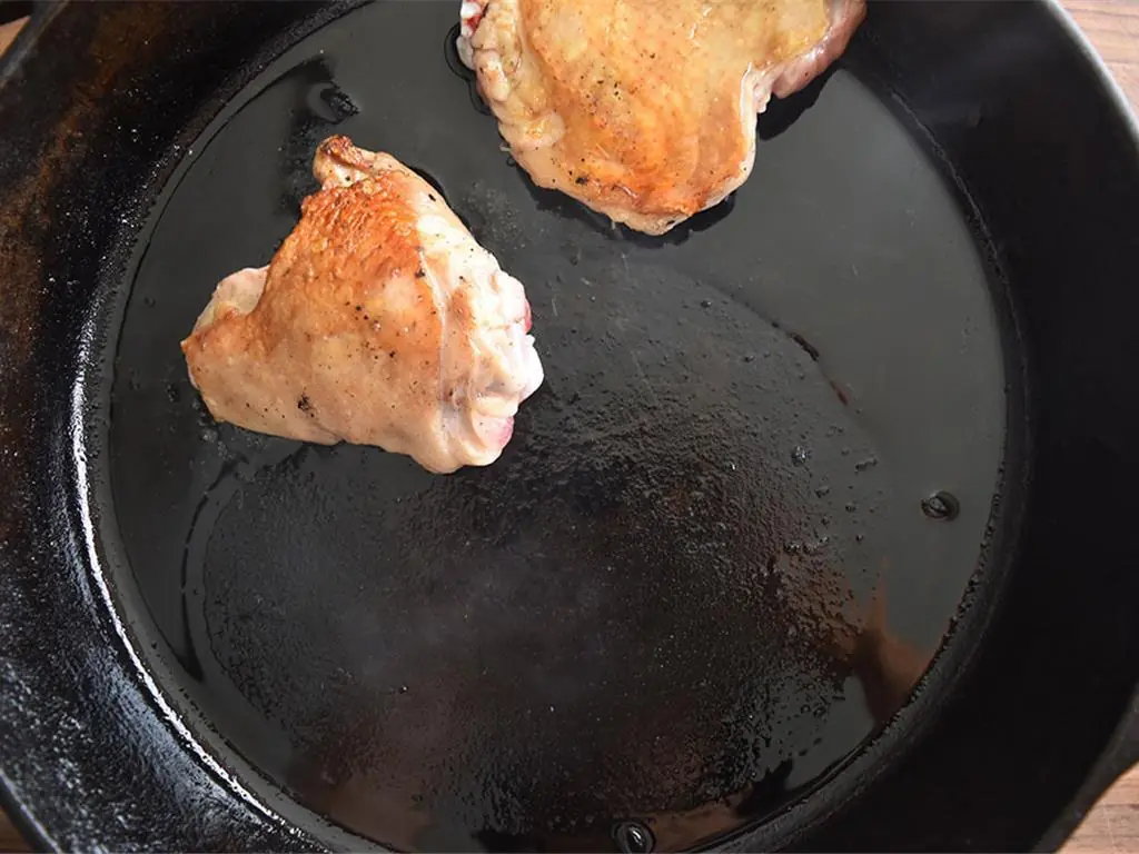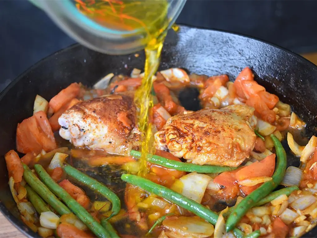 Season Boneless, Skinless Chicken Thigh (1 lb) and Rabbit Legs (6). Heat Extra-Virgin Olive Oil (1/2 cup) in a paella pan over medium-high heat. Sear until a nice, crispy, golden brown.