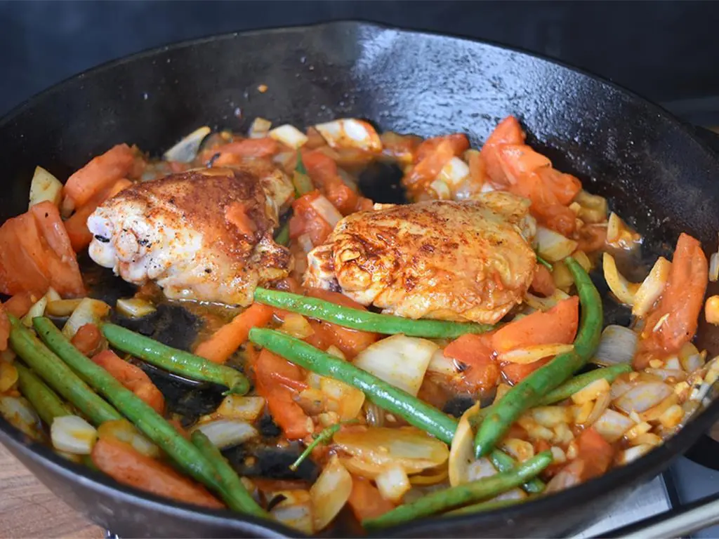 Add Green Beans (2 cups), Garlic (3 cloves), Paprika (1 Tbsp), Tomatoes (3), Salt (to taste), and Ground Black Pepper (to taste). Stir occasionally as flavors begin to meld.