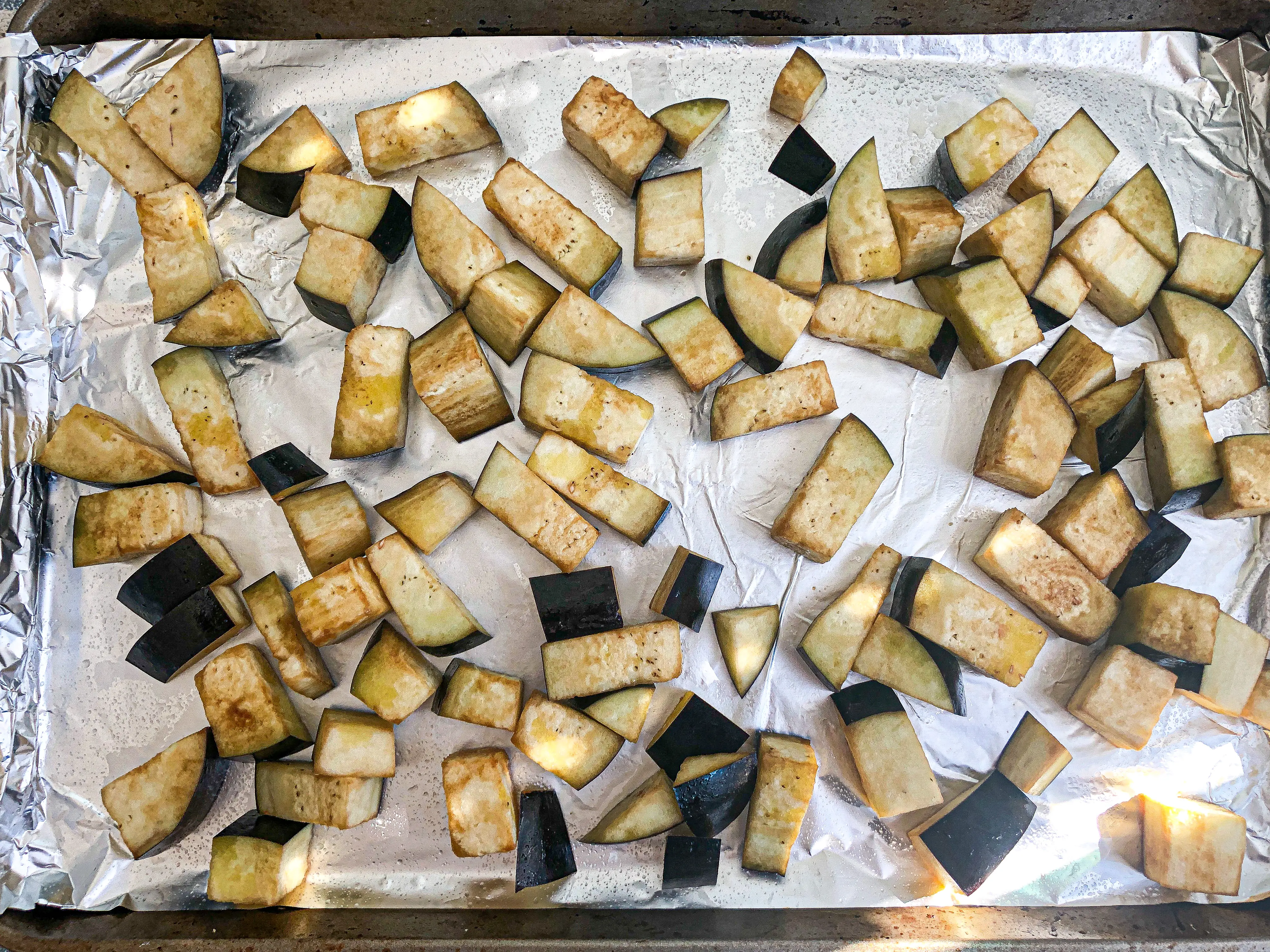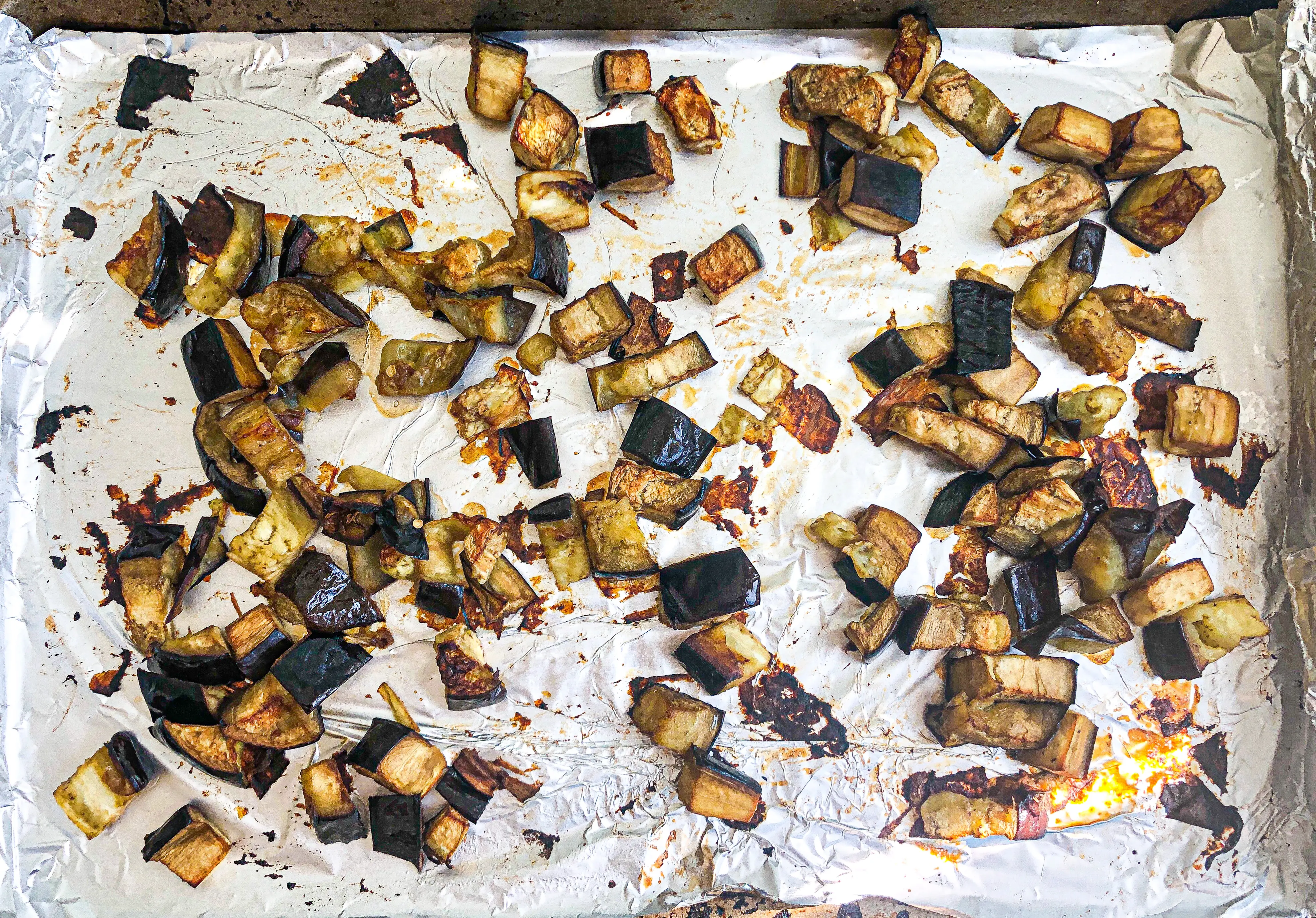 Spread eggplant onto the baking sheet in a single layer and roast for 20 minutes until well browned and tender, stirring halfway through.