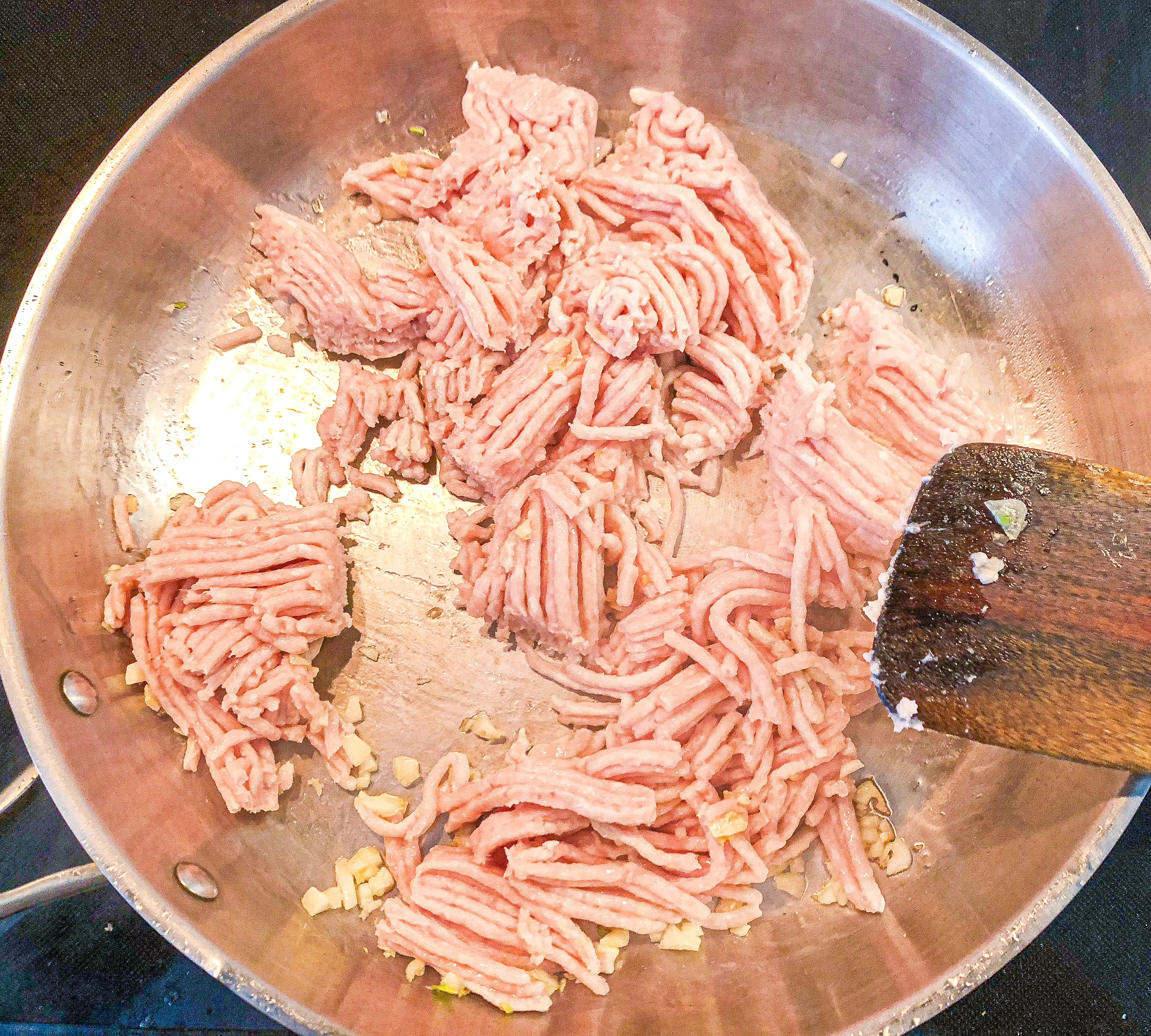 Add the Ground Chicken (1 lb) and season with Salt (to taste) and Ground Black Pepper (to taste). Break into smaller pieces and cook, stirring occasionally until no longer pink, about 5 minutes.