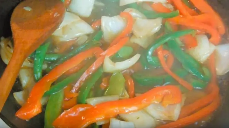 Into the same pan, add additional Oil (1 Tbsp). Stir-fry Green Bell Pepper (1), Red Bell Pepper (1), and Onion (1) for 1-2 minutes.