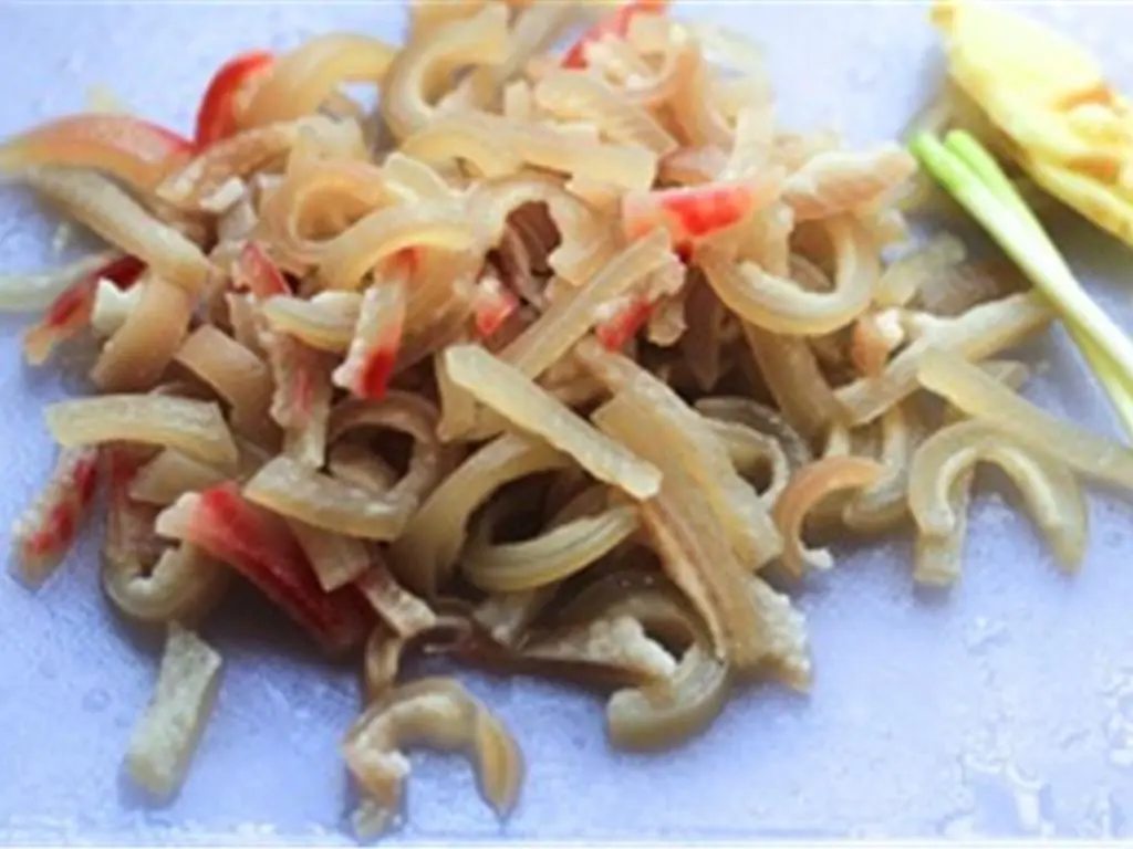 In a pot, add cold water and Pork Rinds (5 oz) to cook for around 5 minutes after boiling until the pork skin becomes slightly transparent. Transfer the pork rind out and rinse in running water. Remove impurities and fat layer. Cut the pork rind into small strips.