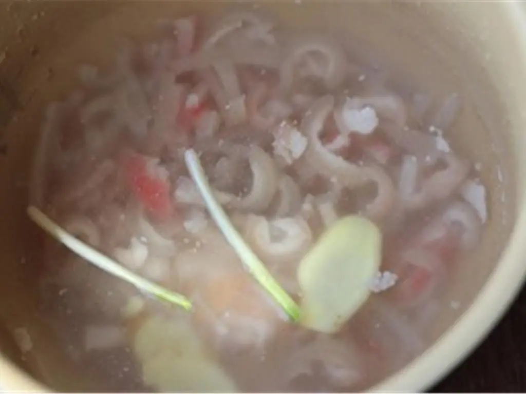 In a high pressure cooker or pot, add enough water to cover the pork rinds. Add Fresh Ginger (4 slices) and several Scallion (1 bunch) sections. Cook for at least 40 minutes for high pressure cooker and at least one and half hour for ordinary cooker. Leave the soup to cool down.