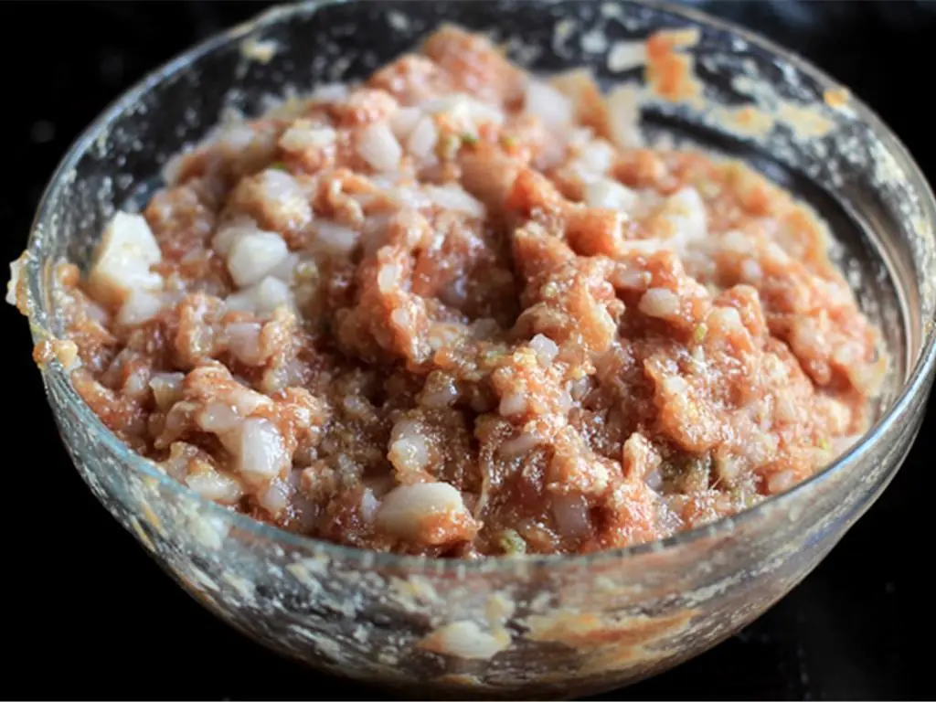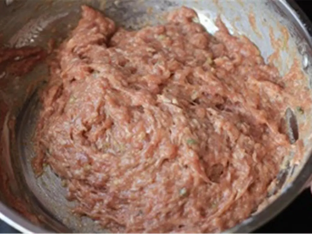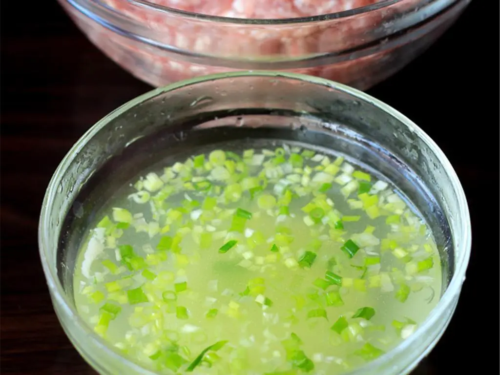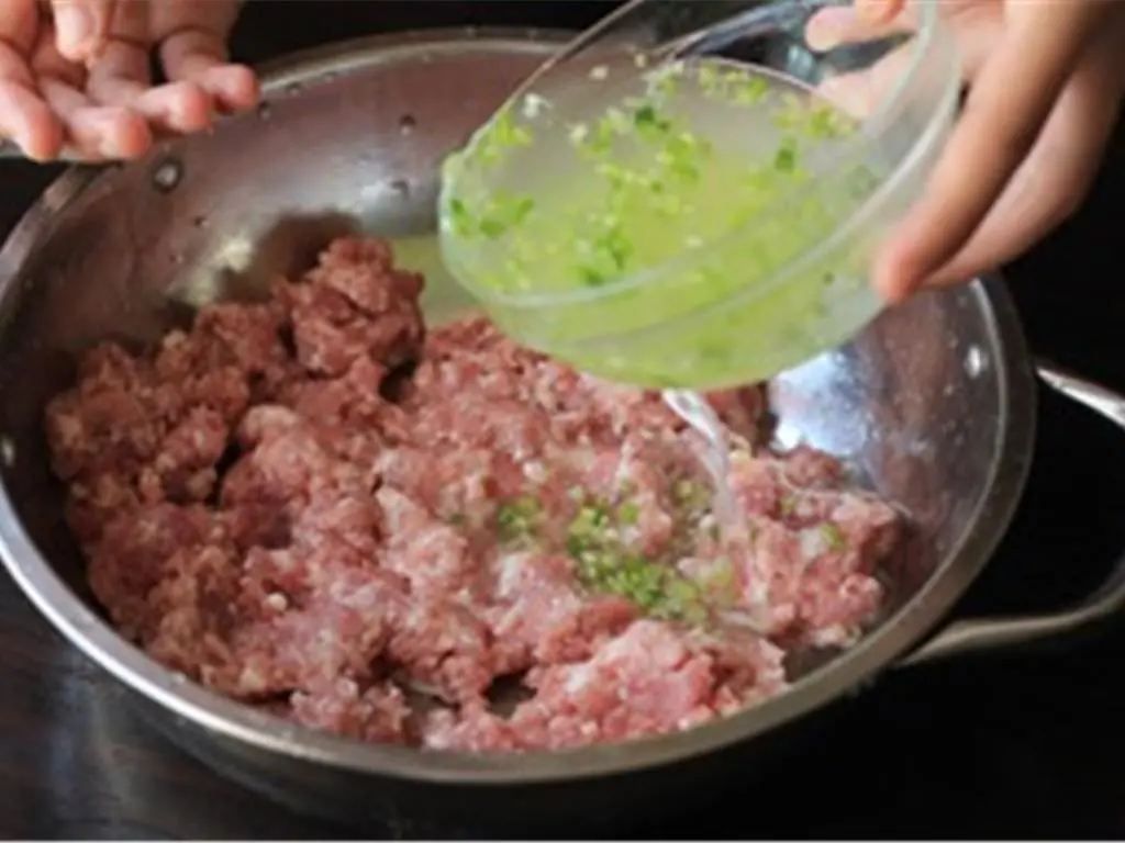 In a large mixing bowl, mix the ginger and green onion water with the Ground Pork (1 lb) by three batches. Use your hand to stir in one direction until the water is completely absorbed by the minced pork.