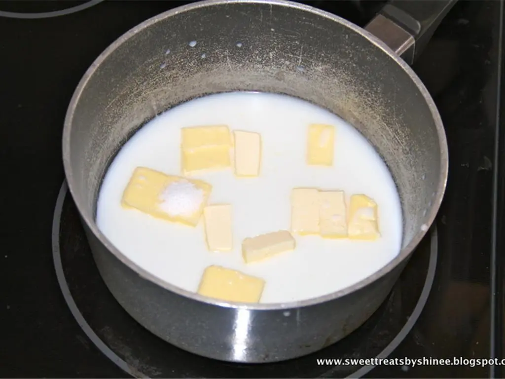 In a medium saucepan, combine Water (1 cup), Unsalted Butter (1/2 cup), Granulated Sugar (1 Tbsp), and Salt (1/4 tsp). Slowly heat the mixture over medium heat, stirring frequently to dissolve sugar and melt the butter. Once sugar is dissolved and butter is melted, increase the heat to medium-high heat and bring the mixture to a boil.