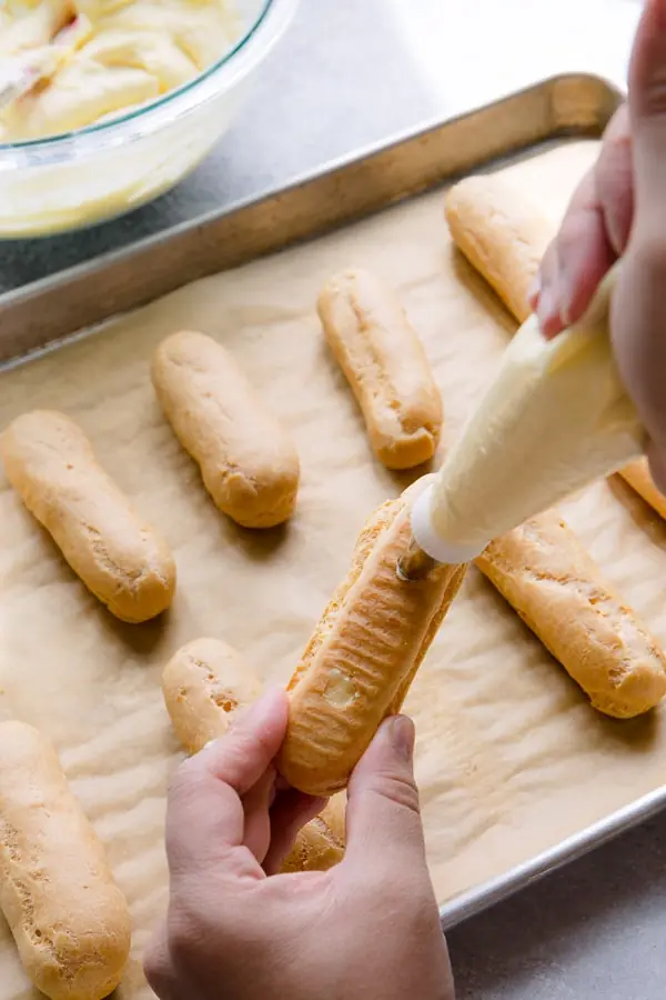 To assemble eclairs, using a sharp pairing knife, make two holes on the bottom of each eclair shell and fill the pastry shells through the holes until the eclairs are filled.