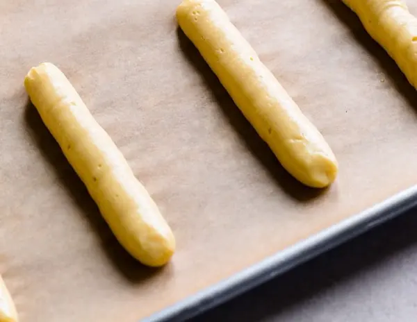 To bake pastry shells, transfer the batter into a large pastry bag and pipe into 4-inch strips or 2-inch rounds 3 inches apart. Level peaked tops with a wet fingertip.
