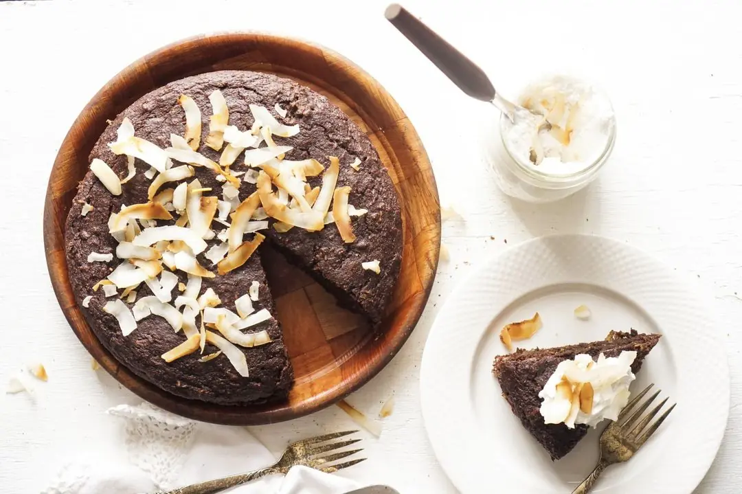 Fudgy coconut chocolate cake spiced with chai-like spices (think cardamom, ginger, nutmeg) naturally sweetened with healthy ingredients.