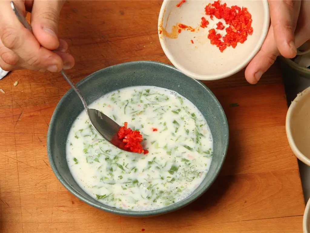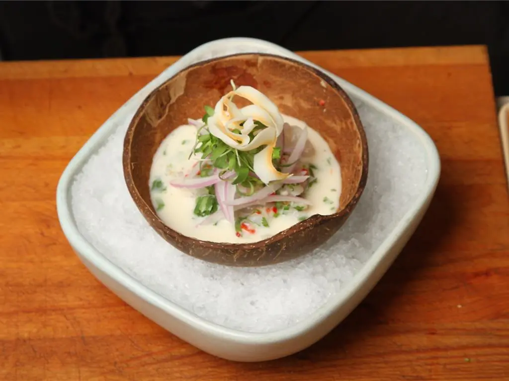Mix the Unsweetened Coconut Cream (1 cup) with the limes and lemons juice, diced jalapeno, diced red onion, Dutch chili, minced ginger, garlic and Salt (to taste). Chill for 30 minutes.
