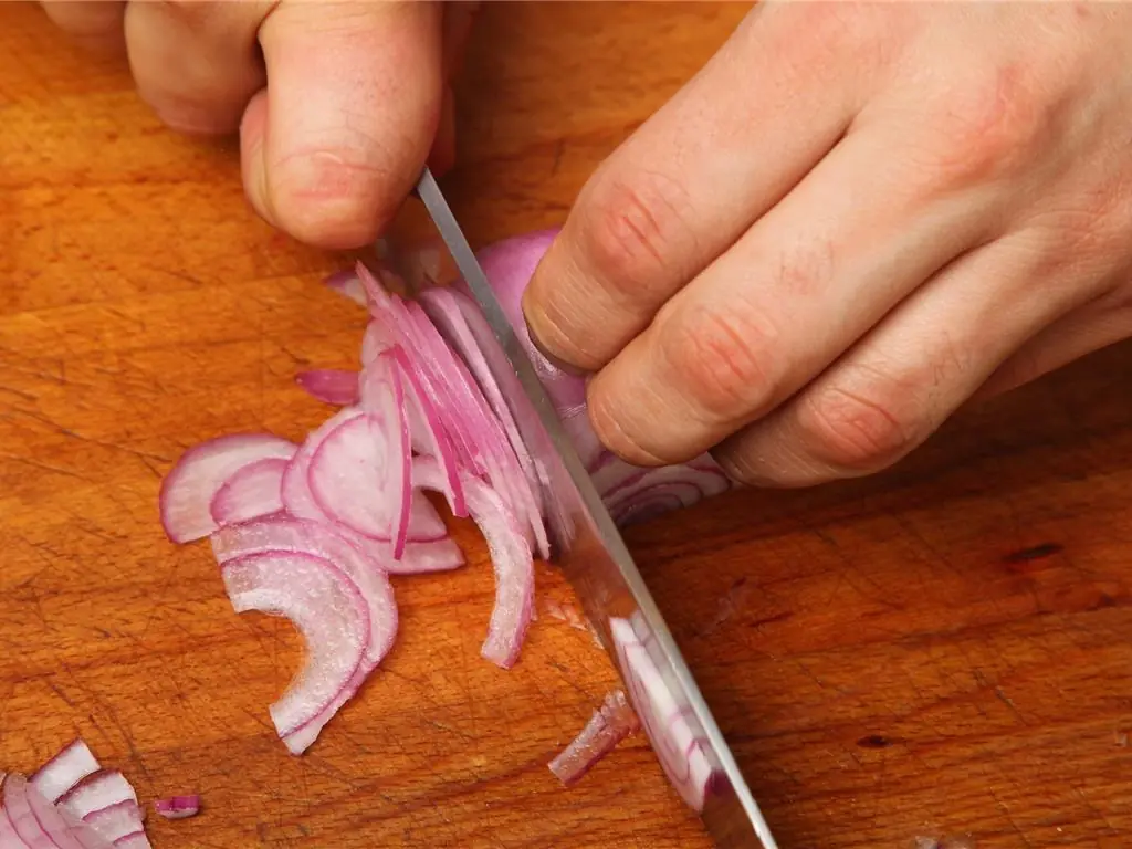 Thinly slice half of the Red Onion (1/2) and dice the other half. Set aside. Thinly slice the Fresh Cilantro (4 pieces).