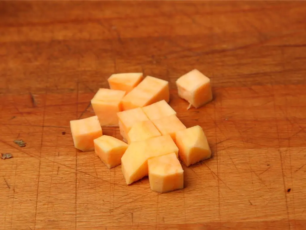 Peel the Sweet Potato (1) and dice. Blanch the diced sweet potato in boiling water until cooked but firm, place them in iced cold water to stop the cooking, remove from the water and reserve.