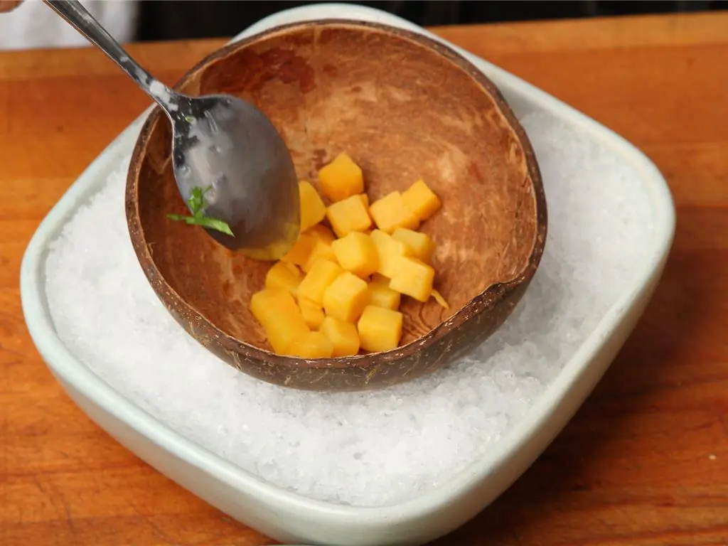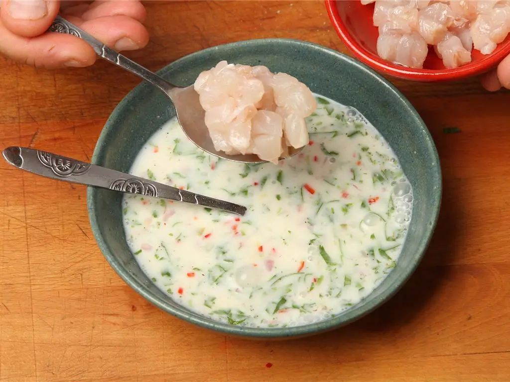 Add the diced king fish to the coconut marinade, enough to cover the fish. Leave to marinate for a couple of minutes.