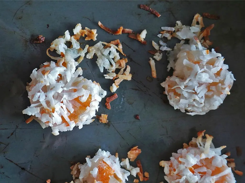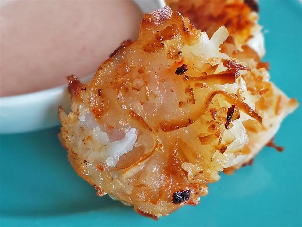 Lay out Unsweetened Shredded Coconut (1/2 cup) on a plate. Dip Shrimp (1 lb) in egg mixture, then coconut. Transfer to pan with hot oil and cook 2-3 minutes on each side until crispy and brown.