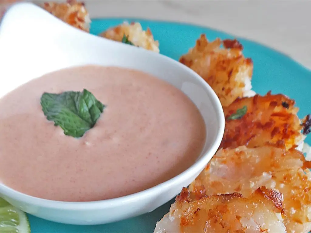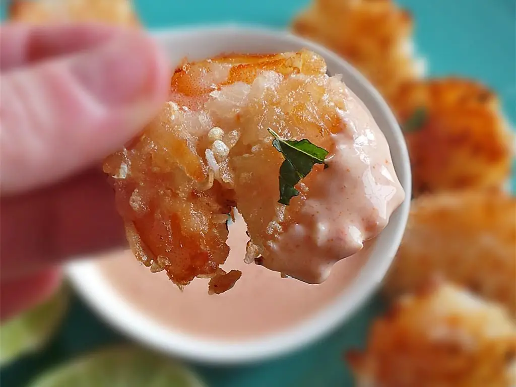 Delicious coconut shrimp with a complimentary red curry coconut dipping sauce garnished with fresh mint leaves. Delicious!