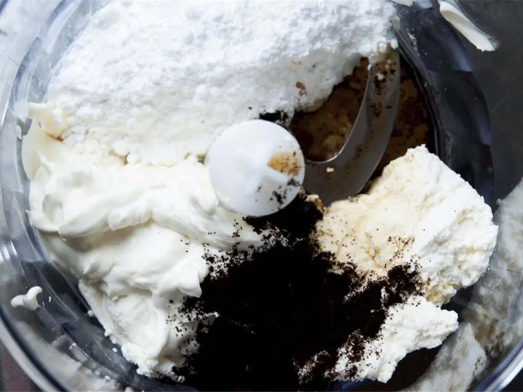 In a blender, combine the Heavy Cream (3/4 cup), Ricotta Cheese (1 cup), Ground Coffee (1 Tbsp), Powdered Confectioners Sugar (1 cup), and the Vanilla Bean Paste (1/2 tsp).