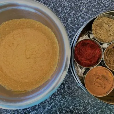 Take a large mixing bowl and mix the Red Chili Powder (1 Tbsp), Garam Masala (1 tsp), Ground Turmeric (1/2 tsp), Ground Coriander (1/2 tsp), Simply Organic Cinnamon, Ground (1/2 tsp), and Ground Cumin (1/2 tsp) together with half of the onion, garlic and ginger puree.