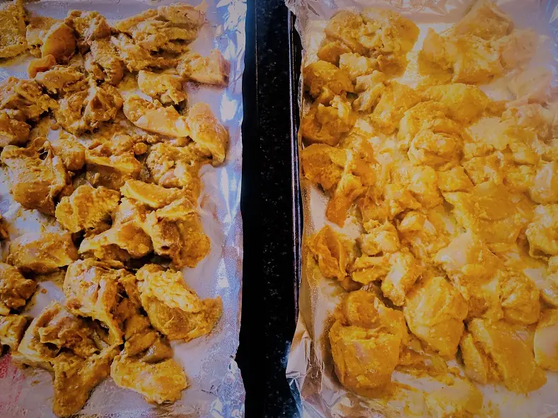 Line two roasting trays with aluminum foil and place the marinated diced chicken on top, spreading it apart so it can cook evenly. Place the trays in the oven and cook for about 30-40 minutes or burnished golden brown on the edges. In between, you may need to turn the chicken pieces so they color evenly and switch the position of the trays.