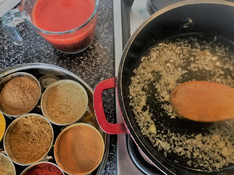Next add in the Tomato Passata (2 1/2 cups) followed by the Red Chili Powder (1 tsp), Garam Masala (1/2 tsp), Simply Organic Cinnamon, Ground (1/2 tsp), Caster Sugar (1/2 tsp), and simmer for 8-10 minutes. When you see the oil begin to separate you will know the gravy is ready.