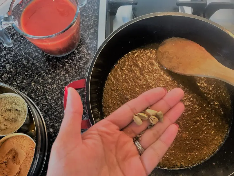 In the meanwhile, you can prepare the gravy by heating Butter (1 1/2 Tbsp) in a medium to large saucepan. Add the rest of the onion, ginger, and garlic puree and sauté for 2-3 minutes until fragrant. Place the Whole Cardamom Pods (3) pods and allow them to flavor.