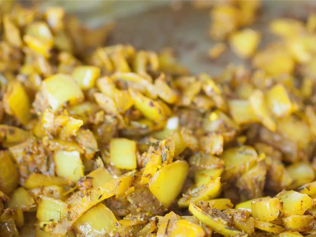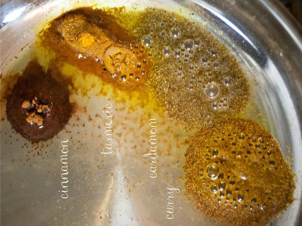 Meanwhile, heat Coconut Oil (1 Tbsp) over medium-low in a large saute pan. Add in the Ground Turmeric (1/2 tsp), Curry Powder (1/2 tsp), Ground Cardamom (1/2 tsp), Simply Organic Cinnamon, Ground (1/2 tsp), Crushed Red Pepper Flakes (to taste), and Ground Nutmeg (1 pinch).