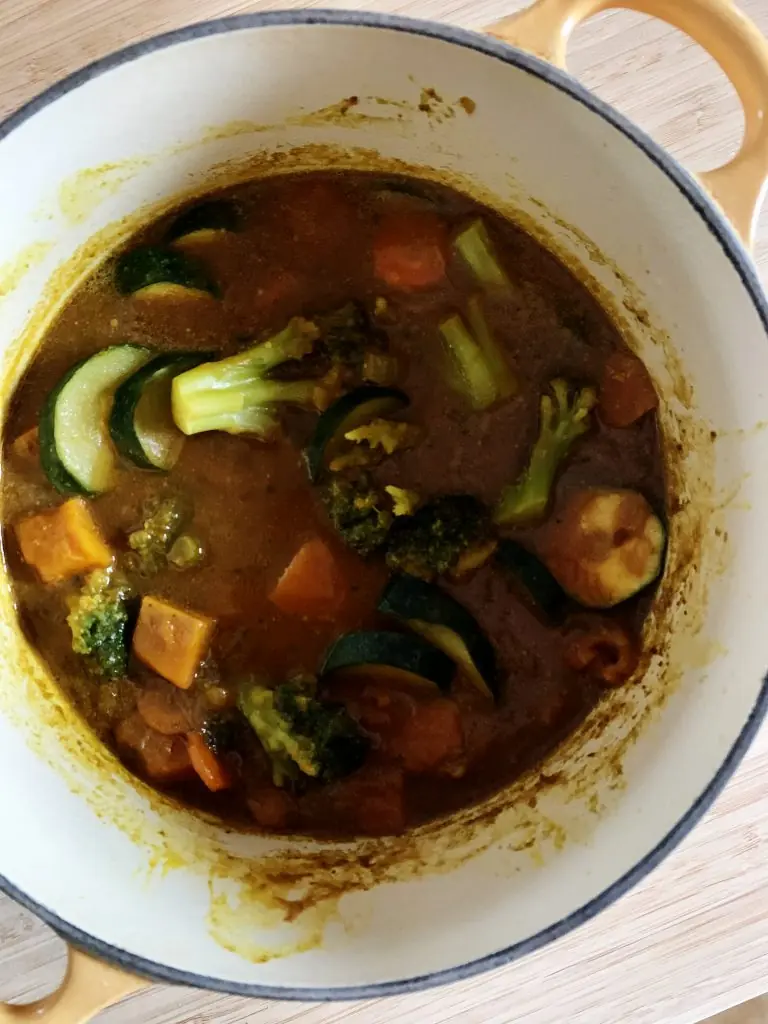 Pour in the curry sauce, bring to a simmer and let cook until all veggies are ready.