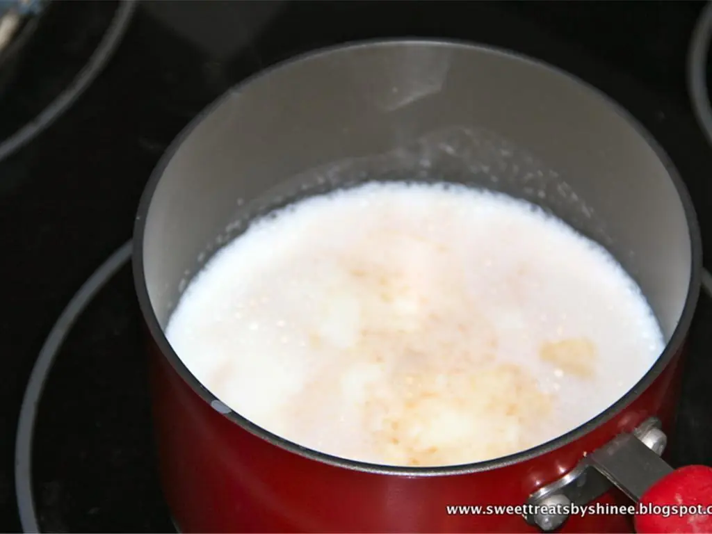 Bring Milk (17 fl oz) and Vanilla Extract (1 tsp) to a boil. Once it boils, turn off the heat.