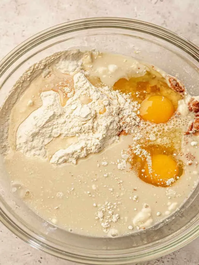 Add White Whole Wheat Flour (1 1/2 cups), Baking Powder (1 Tbsp), Simply Organic Cinnamon, Ground (1 tsp), Eggland's Best Classic Eggs (2), and Oat Milk (1 cup) to a large bowl. Whisk until combined and the batter is smooth.