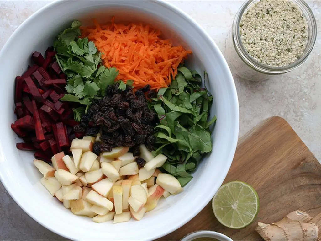 Serve topped with a good sprinkle of Hemp Hearts (3 Tbsp) and some extra raisins if you like as they add a nice sweetness. If you'd like, cut some Tofu (to taste) into cubes and toss it into your salad for an added dose of protein.