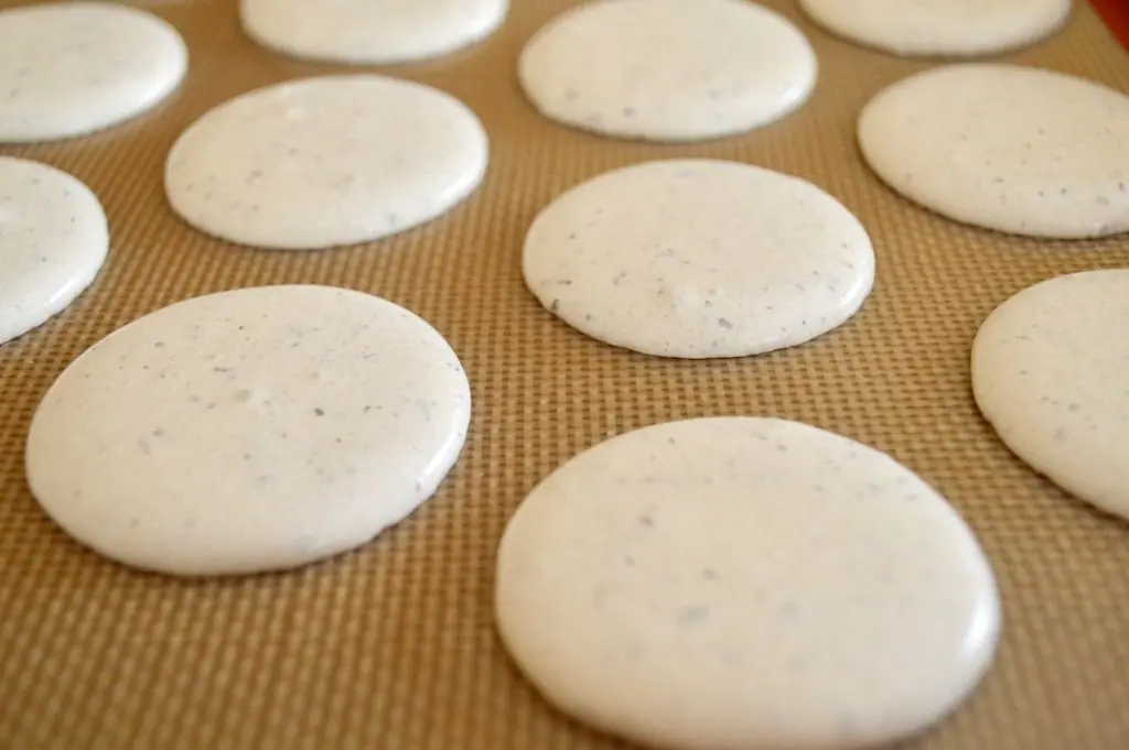 Get out two sheet trays and line them with either silicone mats that have macaron templates on them, or parchment paper. If using parchment paper, draw 30 equal circles on each piece to make yourself a template, and turn them over to have the ink face down.