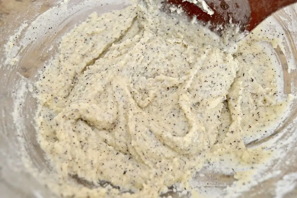 Take the meringue and fold it in thoroughly with the paste in the mixing bowl. You will need to mash it together a little to break up the paste into the meringue. It should become a smooth, shiny, and pretty mixture with the flecks of tea leaves.