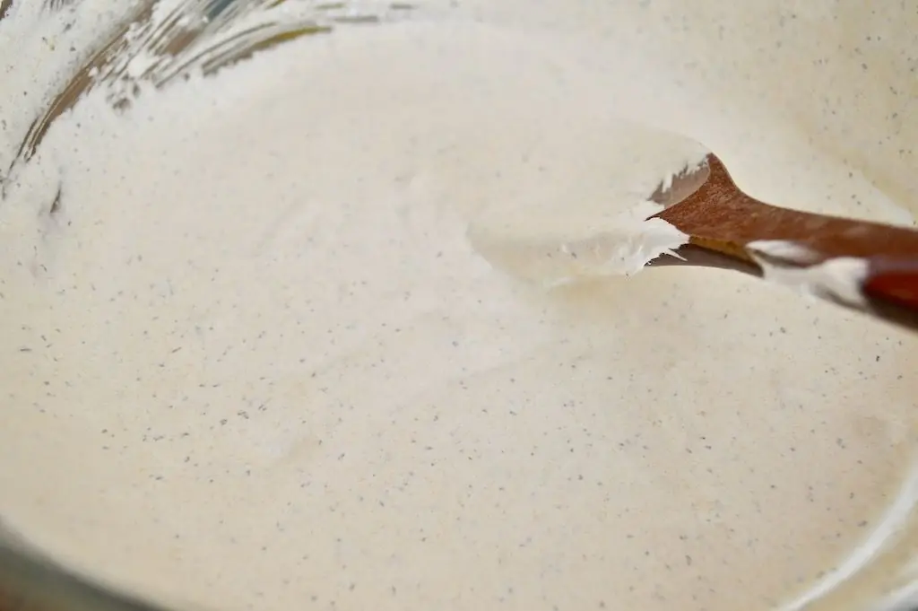 Then pour in half of the Egg Whites (5) and the Vanilla Extract (1 tsp). Use a spatula to fold and mash the mixture together into a uniform paste. Set the paste aside.