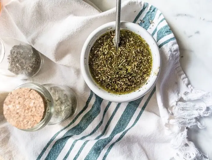 Combine Olive Oil (4 Tbsp), Honey (2 Tbsp), Apple Cider Vinegar (1 Tbsp), Garlic (1 clove), Sea Salt (1 tsp), Dried Parsley (1 tsp), Dried Basil (1 tsp), Italian Seasoning (1 tsp), and Simply Organic Onion Powder (1/4 tsp) in a small bowl and whisk together.