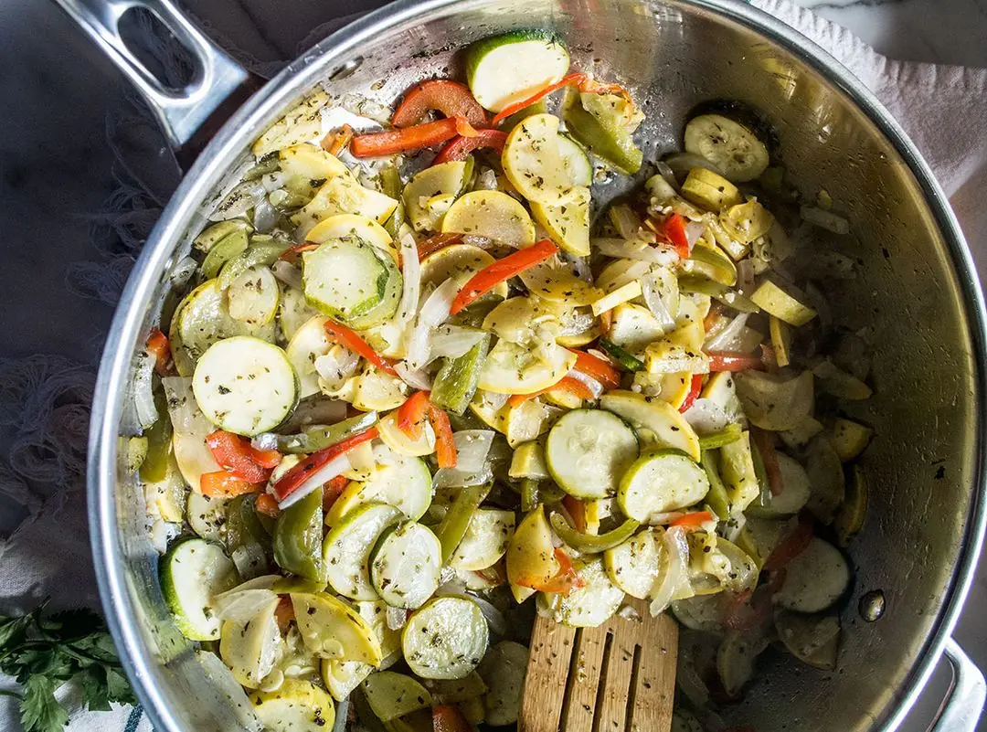 Add Carrot (1/2 cup), Green Bell Pepper (1/2), Red Bell Pepper (1/2), Yellow Squash (1), Zucchini (1), and Sweet Onion (1) to a large skillet, pour dressing over veggies and stir to coat. Cook over medium heat for 10-12 minutes or until vegetables are tender and cooked to your preference.