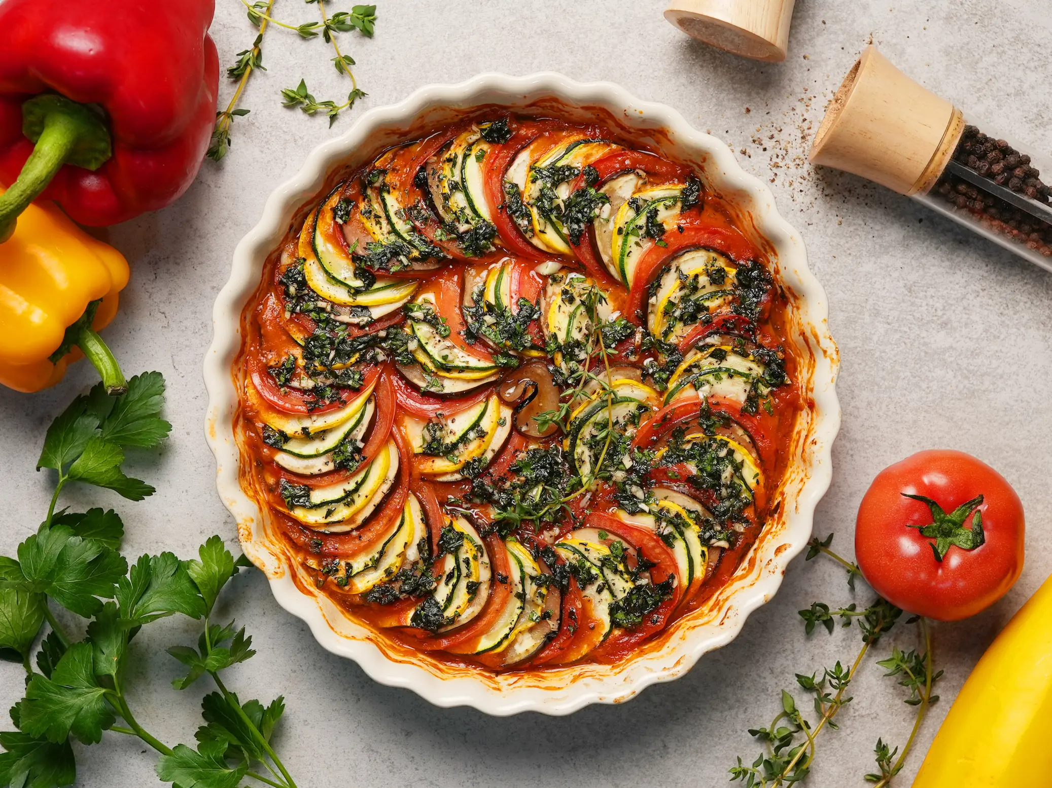Ratatouille, a classic French stew that's very bright and light but rich in flavor! The freshness from the colorful veggies such as eggplant, yellow squash, zucchini, and tomato go very well with the herbal seasoning and citrusy bell pepper sauce. This is a great way to turn simple veggies into a magical comforting veggie dish perfect for lunch or dinner.