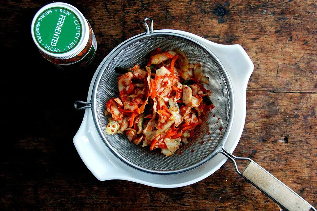 Drain Vegan Kimchi (1 jar) in a colander or sieve, reserving the liquid. If necessary, chop the kimchi.