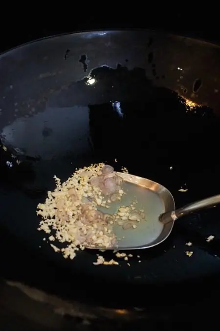 Heat Cooking Oil (2 Tbsp) in a wok over medium high heat. Saute Garlic (3 cloves) and Shallot (1) until garlic is slightly brown on the edges.