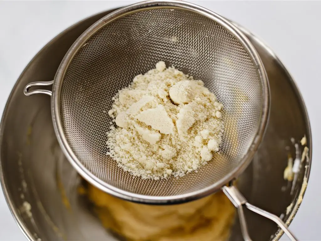Remove bowl from stand mixer, and sift in Almond Meal (1/3 cup).