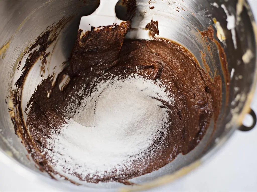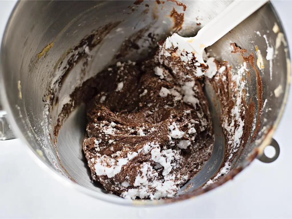 Carefully fold in a third of egg white mixture. Alternate adding remaining thirds of flour and egg whites, until all has been added.