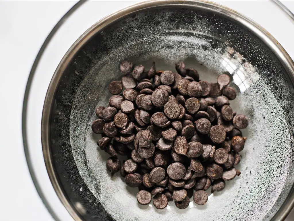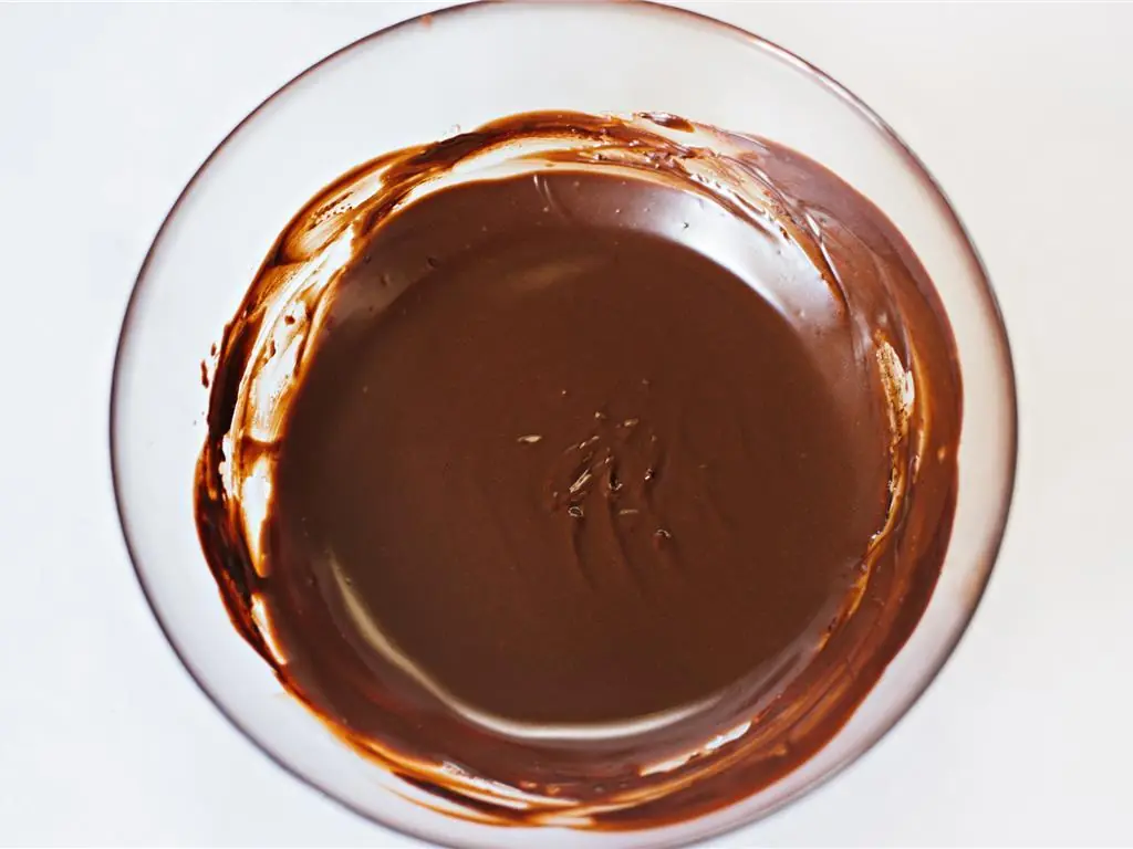Melt Dark Chocolate (1/4 cup) over a saucepan with simmering water. Stir until melted, about four minutes.