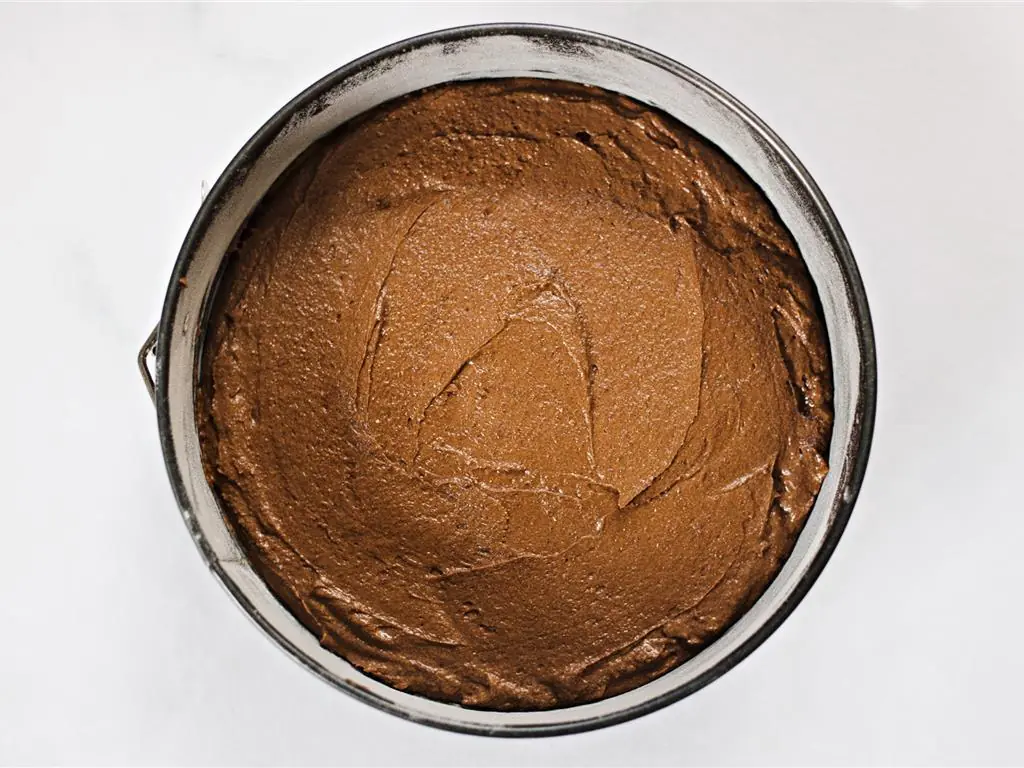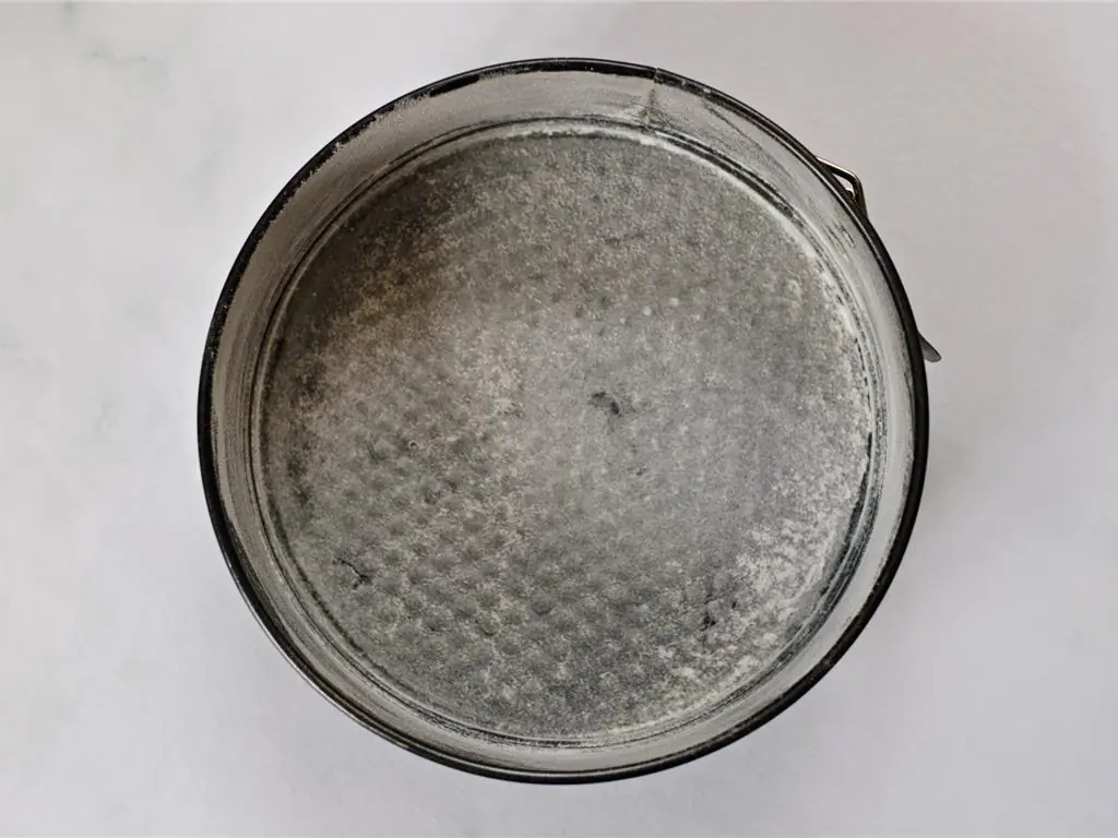 Prepare a springform pan (about eight inches) by buttering and flouring, or spraying with cooking spray.