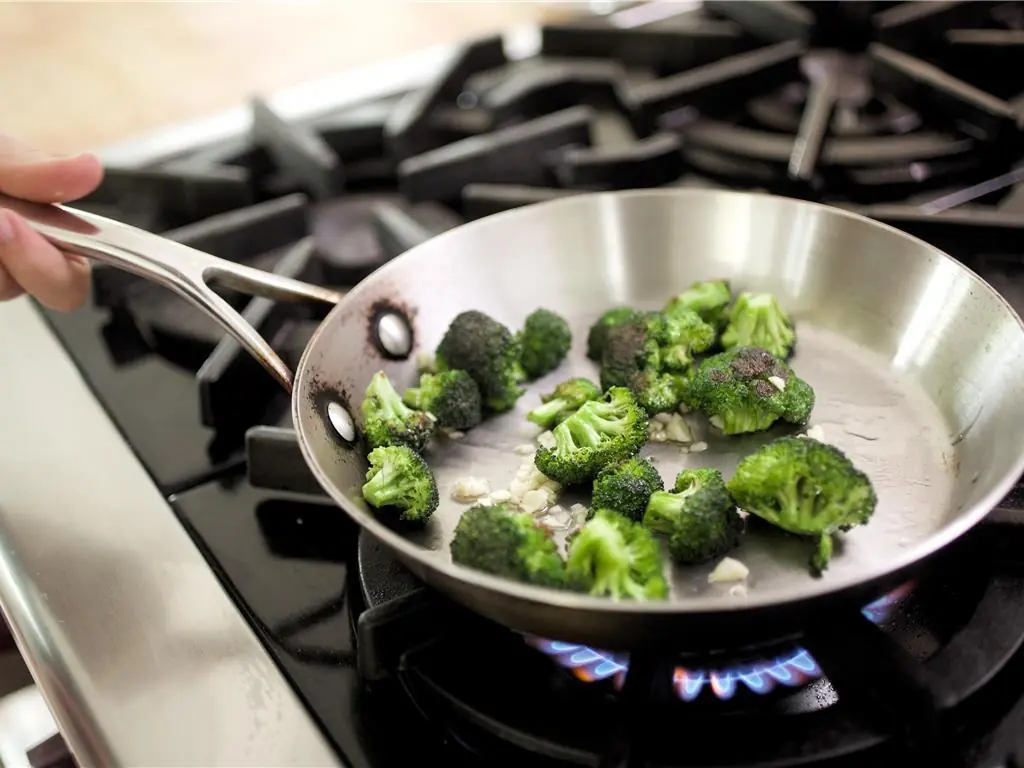 Add two tablespoons of water to the broccoli and cook for another 3 minutes. Season with salt and pepper.