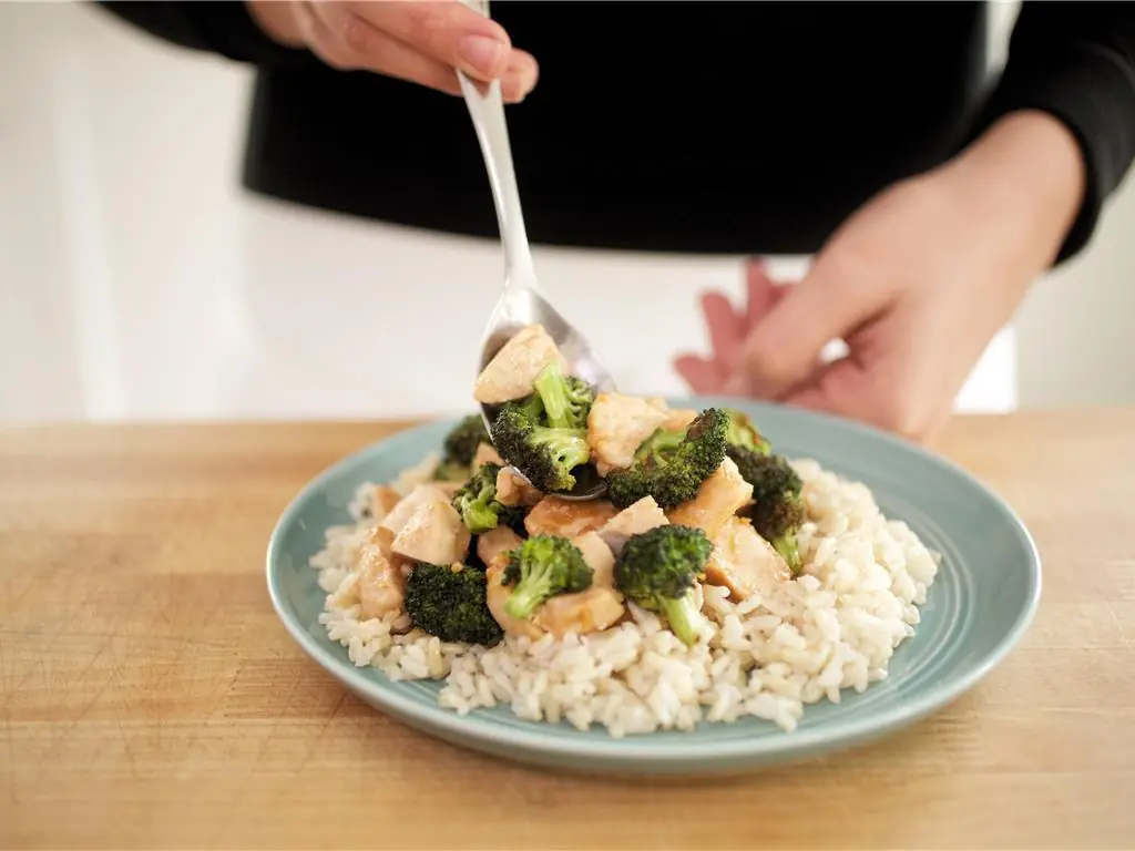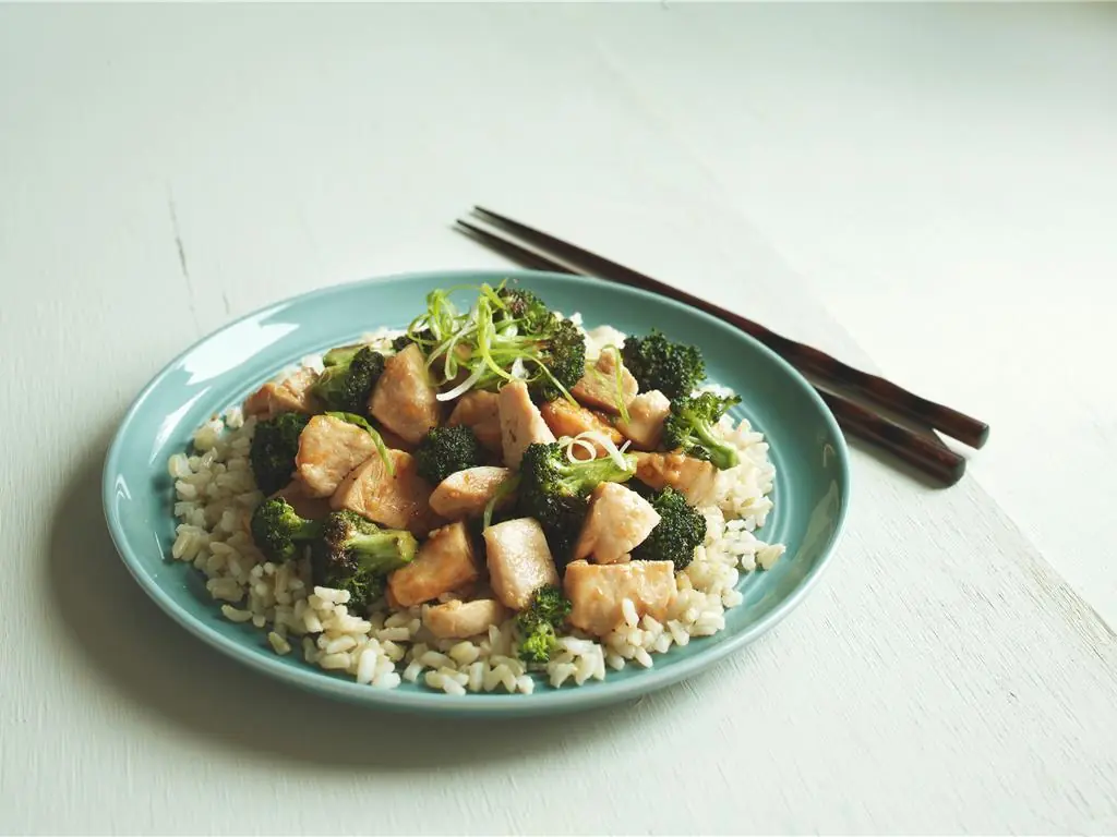 Divide the rice between two plates and place chicken and broccoli over the rice.