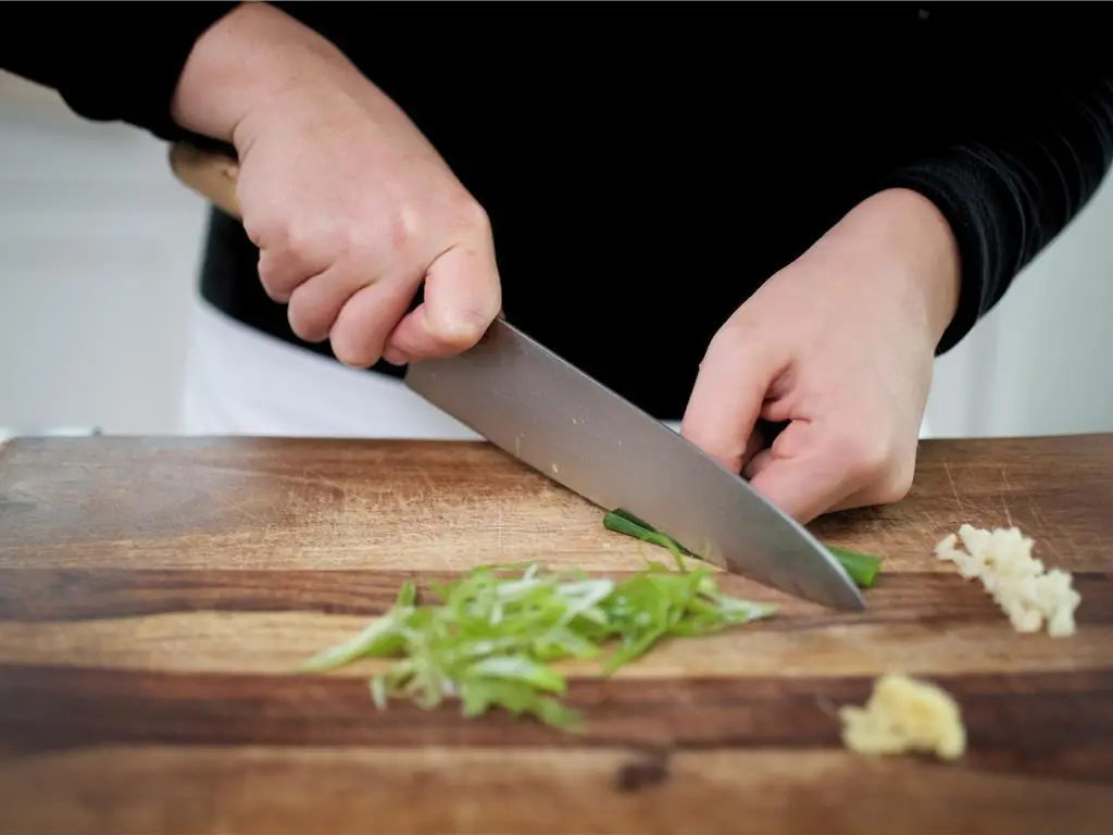 Mince the Garlic (2 cloves) divide in half. Using the back of a spoon or a peeler, peel and mince the Fresh Ginger (1 1/3 Tbsp). Slice the Scallion (1 bunch) diagonally. Set aside.