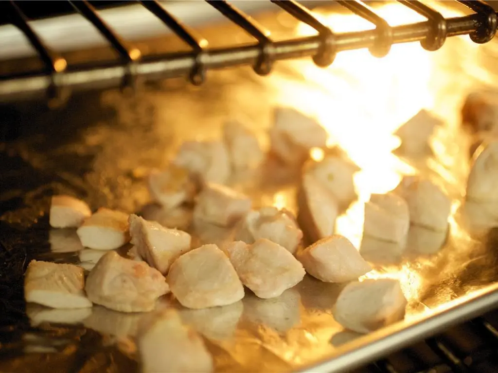 Pat dry the Chicken Breasts (2) and cut into 1 inch cubes. On a baking sheet lined with foil, toss the chicken with 1 tablespoon of Corn Starch (1 Tbsp). Place in oven and roast for 13 to 15 minutes.