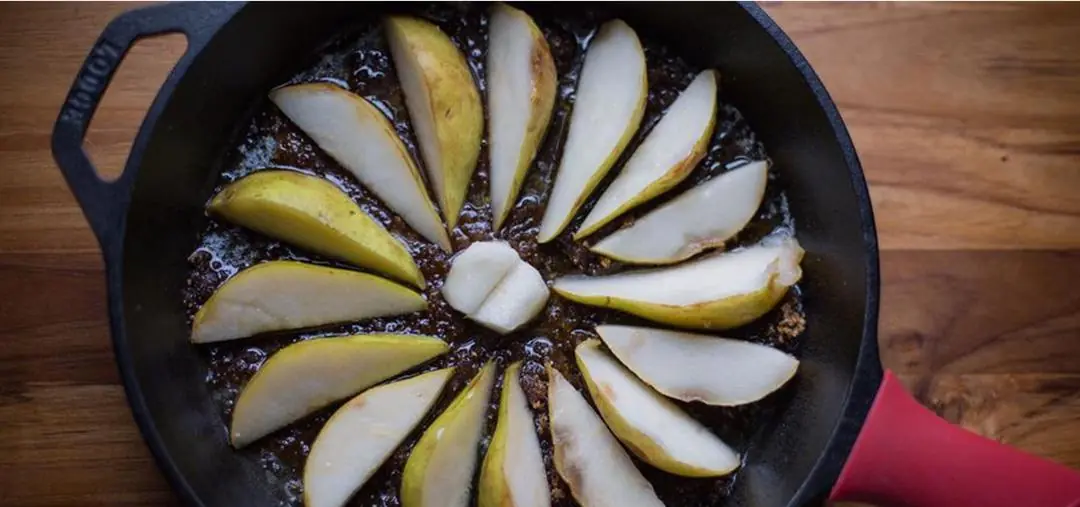Melt Butter (4 Tbsp) in a 12-inch cast iron skillet on the stovetop over medium-low heat. When butter has fully melted, turn skillet to coat the sides up to the rim. Sprinkle Brown Sugar (1/2 cup) over the surface and wait 3-4 minutes, until sugar has partially melted.